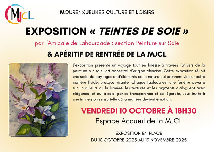 Nous sommes très heureux d'accueillir L'atelier peinture sur soie de Lahourcade qui nous présente une exposition de peinture sur soie " teintes de soie"